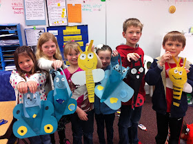 Students have been learning about and observing butterflies.  We decided it would be fun to integrate some math into our butterfly study.  We learned about symmetry.  The students each decorated one side of a butterfly, then they traded with a friend.  Each student matched the other side of their friend's butterfly to create a symmetrical butterfly.  Here are the partners and their beautiful creations!